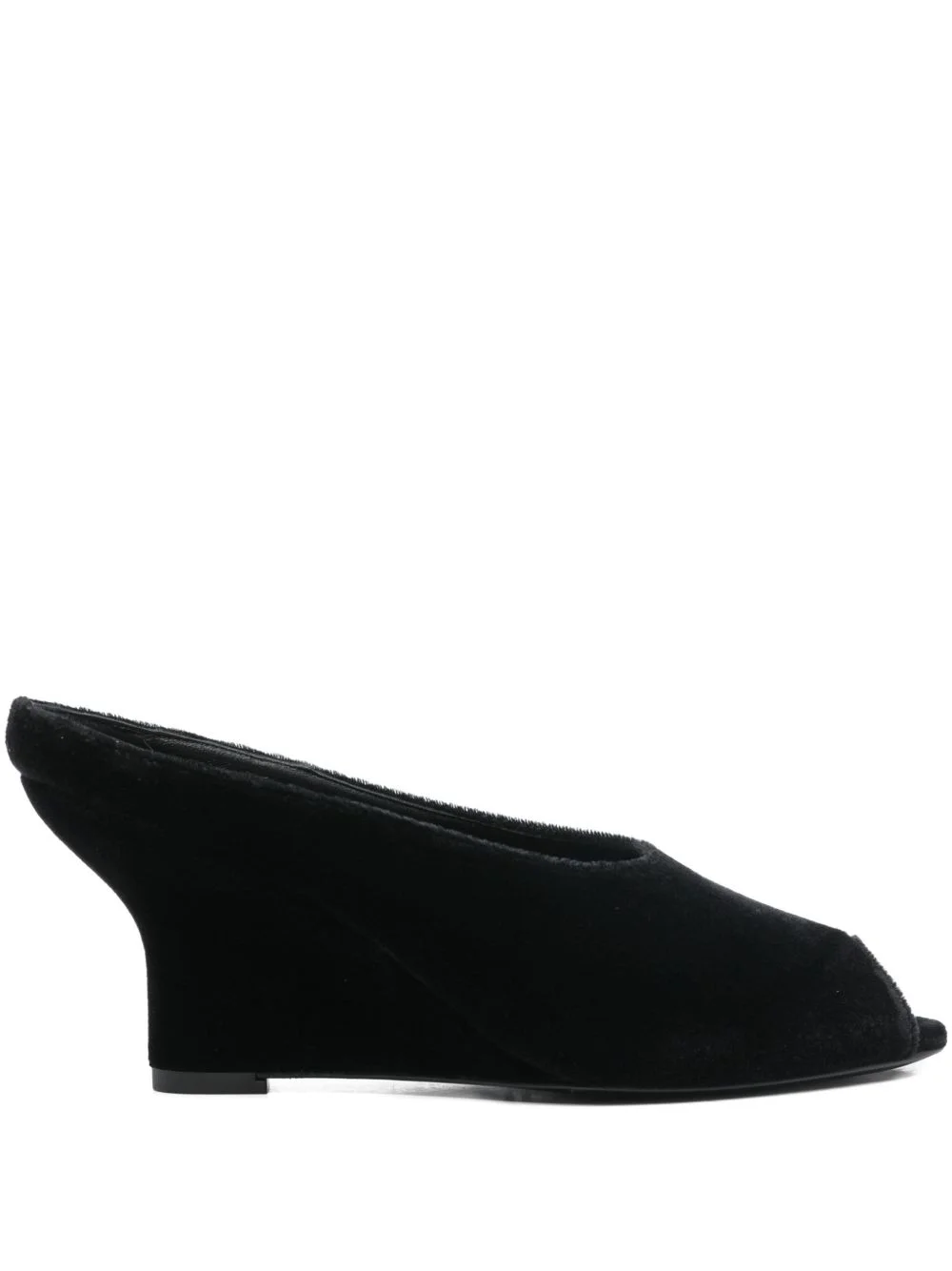 75mm peep-toe velvet wedge sandals Highlights - Black - Velvet finish - Peep-toe - Wedge heel Made in Italy Composition Outer: Recycled Polyester 100% Lining: Sheep Skin/Shearling 100% Sole: Calf Leather 100% SIZE & FIT Measurement HEEL 2.95 in(7.5 cm)