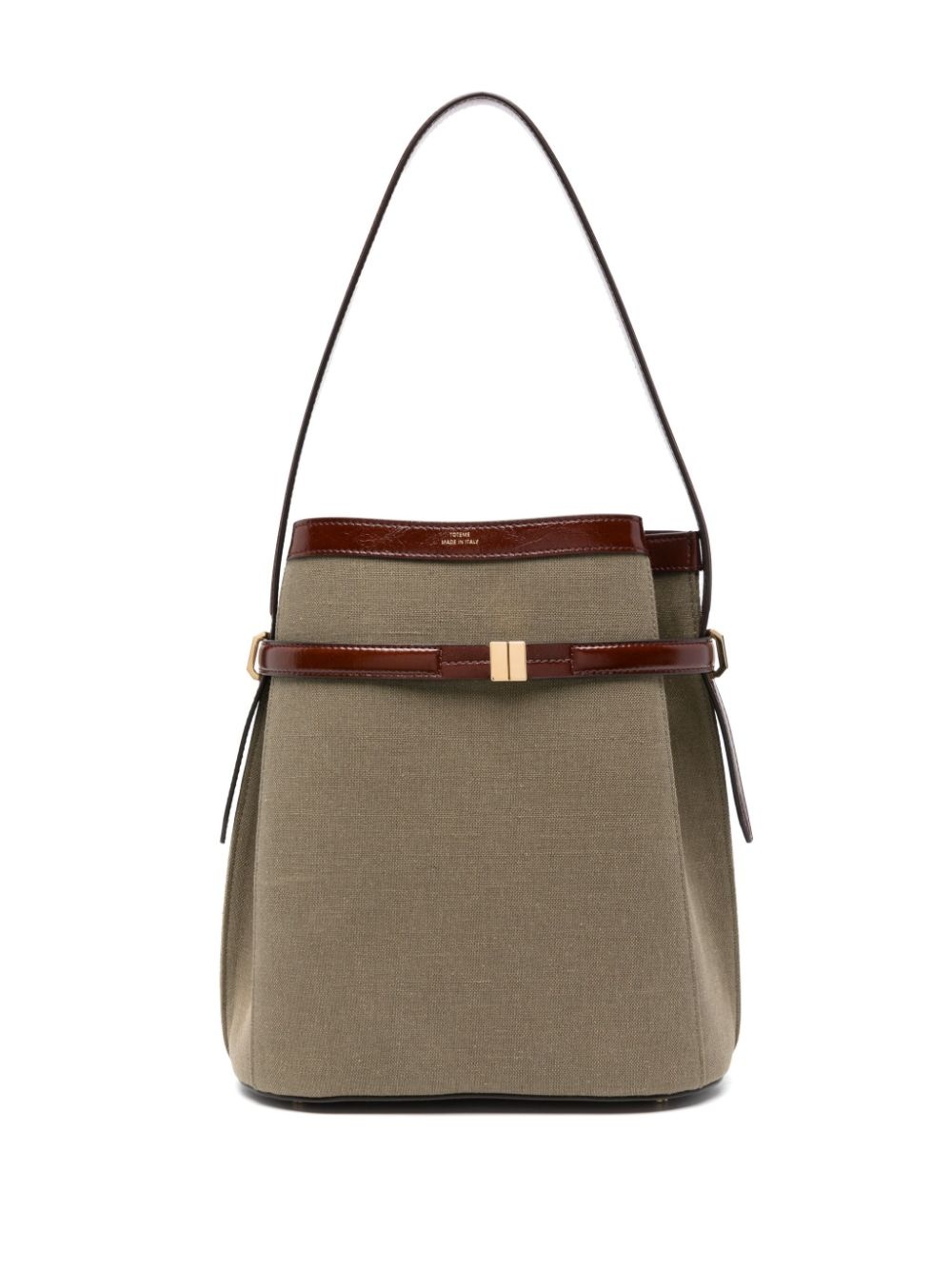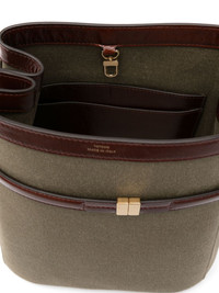 belted bucket bag Highlights - Khaki - Canvas - Leather trim - Bucket body - Detachable belt - Clasp fastening - Single shoulder strap - Main compartment - Multiple internal slip pockets - Metal feet Made in Italy Composition Outer: Cotton 44%, Linen/Flax 44%, Acrylic 12% SIZE & FIT Model measurements Height 5 ft 10 in(1.78 m) Bust/Chest 33.46 in(85 cm) Hips 36.22 in(92 cm) Waist 23.22 in(59 cm) Measurement DEPTH 5.9 in(15 cm) HEIGHT 11.81 in(30 cm) STRAP 26.37 in(67 cm) WIDTH 10.62 in(27 cm)
