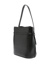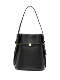 belted leather bucket bag Highlights - Black - Calf leather - Smooth grain - Panelled design - Lobster claw fastening - Single shoulder strap - Logo stamp to the front - Expandable sides with belted clasp fastening - Metal feet - Main compartment - Multiple internal slip pockets - This piece comes complete with a protective dust bag. Made in Italy Composition Outer: Calf Leather 100% SIZE & FIT Measurement DEPTH 5.9 in(15 cm) HEIGHT 11.81 in(30 cm) MINIMUM WIDTH 9.44 in(24 cm) STRAP 24.8 in(63 cm) WIDTH 11.02 in(28 cm)
