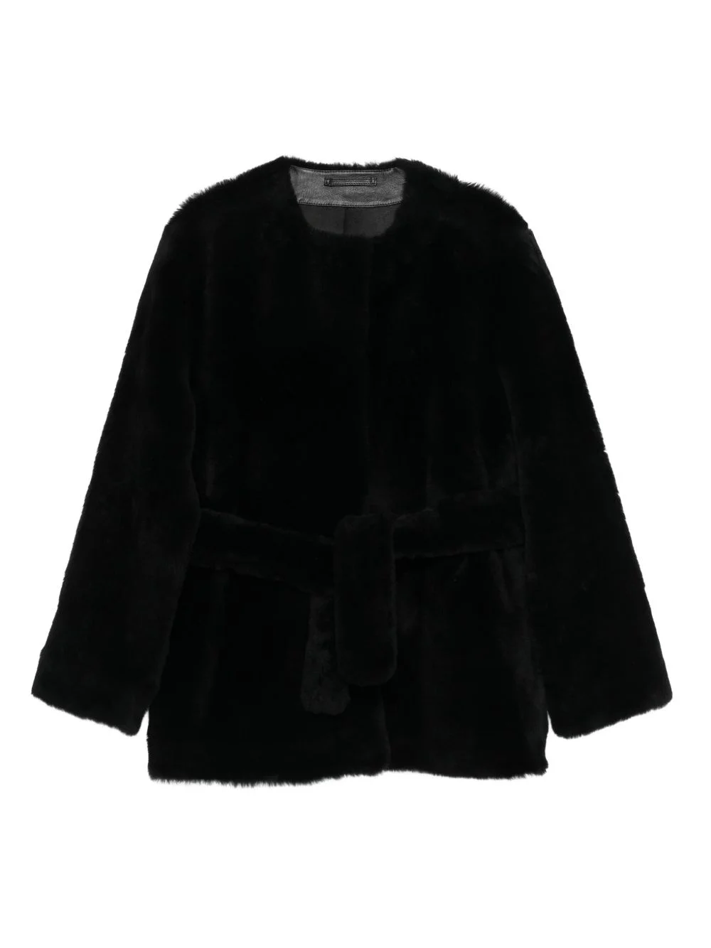 belted shearling jacket Highlights Imported Composition Lambskin 100%, Lamb Shearling 100% SIZE & FIT Model measurements Height 5 ft 9 in(1.75 m) Bust/Chest 34.64 in(88 cm) Hips 36.61 in(93 cm) Waist 26.37 in(67 cm)