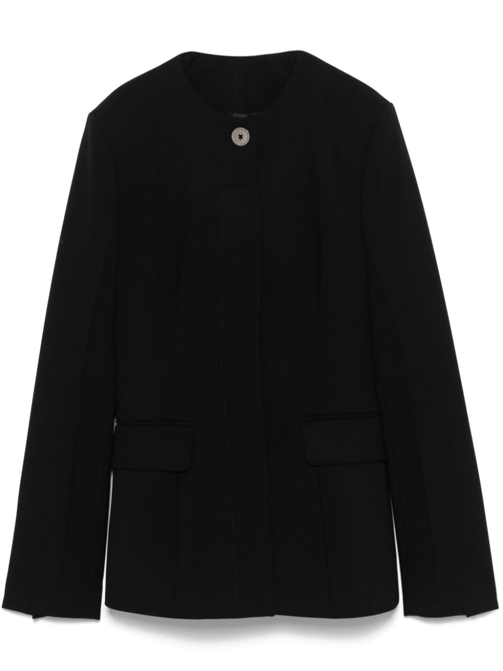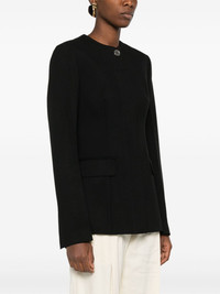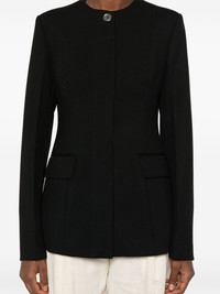 collarless cinched jacket Highlights - Black - Wool blend - Textured finish - Collarless - Fitted waistline - Concealed front button fastening - Shoulder pads - Long sleeves - Long sleeves - Buttoned cuffs - Two side flap pockets - Full lining - Straight hem Imported Composition Outer: Wool 60%, Recycled Polyester 40% Lining: Viscose 100% SIZE & FIT Model measurements Height 5 ft 10 in(1.78 m) Bust/Chest 31.49 in(80 cm) Hips 37 in(94 cm) Waist 23.62 in(60 cm) FittingInformation Designed for a relaxed fit, this piece allows for comfort and movement when worn Made from a midweight non-stretch fabric