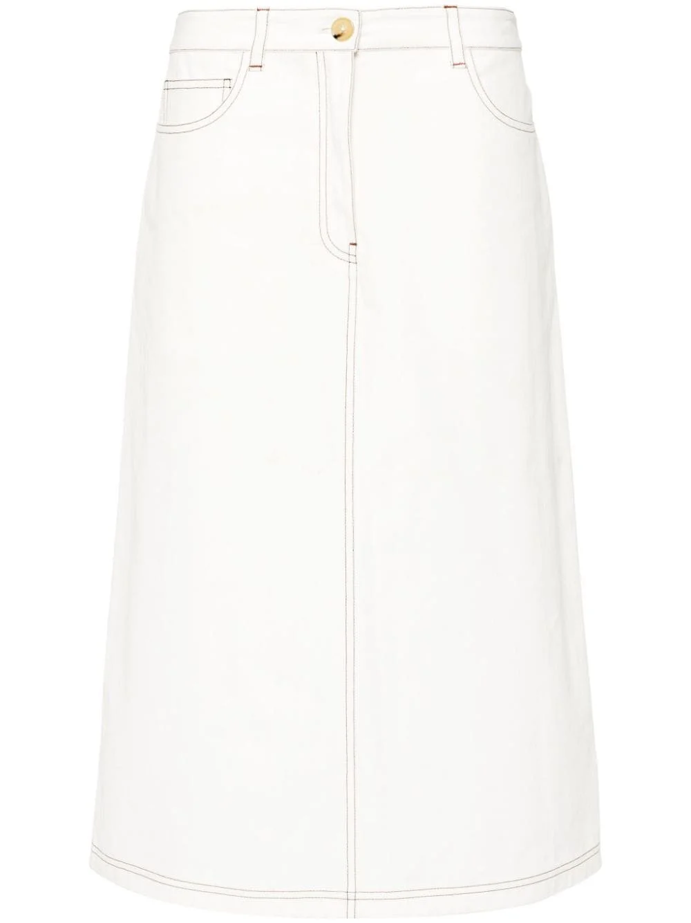 contrast-stitching midi skirt Highlights - White - Organic cotton - Twill weave - Contrast stitching - Low-rise - Belt loops - Classic five pockets - Below-knee length - Straight hem - Front concealed zip-fly and button fastening Imported Composition Organic Cotton 100% SIZE & FIT Model measurements Height 5 ft 11 in(1.8 m) Bust/Chest 33.07 in(84 cm) Hips 37.4 in(95 cm) Waist 25.19 in(64 cm) Measurement LENGTH 27.55 in(70 cm) WAIST 27.55 in(70 cm) FittingInformation This midi-length skirt is intended to be worn just below the waist Made from a midweight non-stretch fabric This piece fits true to size – take your usual size