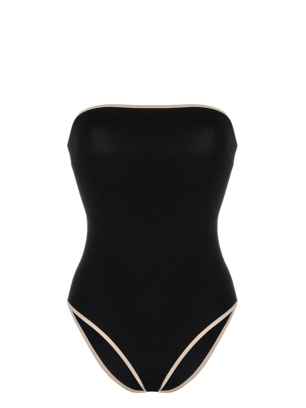 striped-edge strapless swimsuit Highlights - Black/light beige - Contrasting trim - Square neck - Silicone grip - Strapless - High cut - Be mindful to try on swimwear over your own garments. Imported Composition Polyamide 100% Washing instructions Dry Clean Only