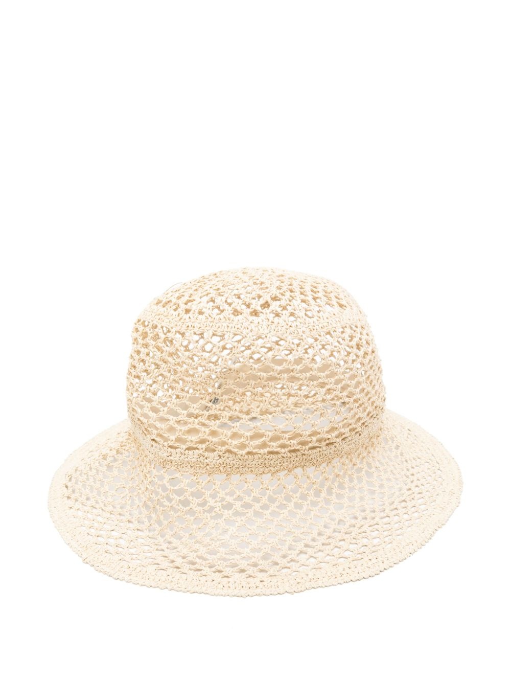 crochet hat Highlights - Light beige - Round crown - Dropped wide brim - Perforated design Made in Italy Composition Cotton 100%, Paper 100% SIZE & FIT Measurement BRIM 3.14 in(8 cm) CIRCUMFERENCE 19.68 in(50 cm)