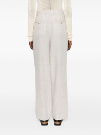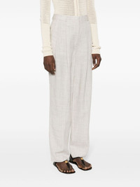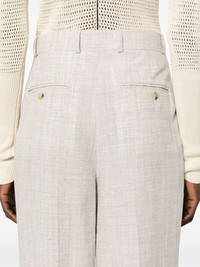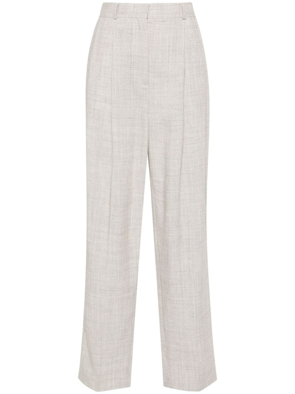 double-pleated tailored trousers According to the brand, these light-grey trousers are 'a new expression of TOTEME's distinctive tailoring codes.’ Cut from a blend of linen, they’re double pleated at the front to create volume throughout the straight leg. Highlights - Light grey - Interwoven design - Melange effect - Tailored design - Belt loops - Two side slash pockets - Double-pleat detailing - Ankle-length - Two rear button-fastening jetted pockets - Straight leg - Concealed front button, hook and zip fastening Imported Composition Viscose 75%, Linen/Flax 20%, Polyester 5% SIZE & FIT Model measurements Height 5 ft 11 in(1.8 m) Bust/Chest 32.67 in(83 cm) Hips 36.22 in(92 cm) Waist 24.4 in(62 cm) FittingInformation Designed for a tapered fit, these trousers allow for a close fit at the waist and a loose unrestricted fit over the leg with a closer fit towards the ankle Made from a midweight non-stretch fabric This piece fits true to size – take your usual size