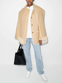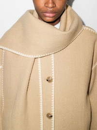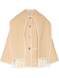embroidered scarf button-front jacket With an interest in modern day uniforms, TOTEME's harvest brown oversized jacket combines an in-built scarf and contrasting crochet stitched trim. Fabricated from a wool-blend, the structured silhouette boasts T-branded button hardware and two front patch pockets. Imported Composition Wool 88%, Polyester 12% SIZE & FIT Model measurements Height 5 ft 10 in(1.78 m) Bust/Chest 30.7 in(78 cm) Hips 33.85 in(86 cm) Waist 22.44 in(57 cm) Measurement SLEEVE LENGTH 20.07 in(51 cm) LENGTH 29.52 in(75 cm) Washing instructions Dry Clean Only