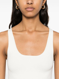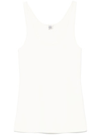 fine-knit tank top Highlights - White - Scoop neck - Sleeveless - Straight hem Made in United States Composition Viscose 53%, Recycled Polyamide 45%, Spandex/Elastane 2% SIZE & FIT Model measurements Height 5 ft 9 in(1.76 m) Bust/Chest 31.1 in(79 cm) Hips 36.61 in(93 cm) Waist 24.8 in(63 cm) FittingInformation Designed for a slim fit that sits just away from the body offering a close yet comfortable fit Made from a midweight stretch fabric, this piece offers elasticity and flexibility when worn
