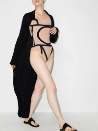 monogram-print swimsuit TOTEME's swimsuit is defined by the black signature monogram print that evokes a contemporary feel. Made in Portugal from a four-way stretch jersey with SPF 50, it is cut to a scoop-neck and high-cut legs silhouette. Imported Composition Polyamide 73%, Elastane 27% SIZE & FIT Model measurements Height 5 ft 9 in(1.76 m) Bust/Chest 33.46 in(85 cm) Hips 37.79 in(96 cm) Waist 25.59 in(65 cm) FittingInformation This piece fits true to size. We recommend you get your regular size Made with a mid-weight stretch fabric Washing instructions Machine Wash