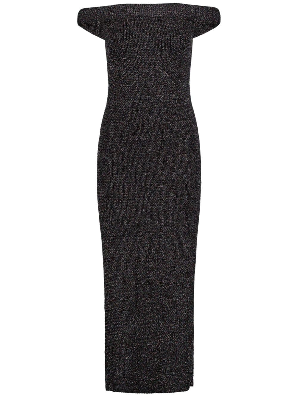 Roll off-shoulder knitted dress Highlights - Black - Waffle knit - Lurex detailing - Folded edge - Off-shoulder - Pull-on style - Sleeveless - Maxi - Straight hem Made in France Composition Viscose 44%, Polyamide 31%, Polyester 16%, Cotton 7%, Elastane 2% SIZE & FIT Measurement LENGTH 43.7 in(111 cm) WAIST 24.4 in(62 cm) BUST 22.83 in(58 cm) FittingInformation Designed for a slim fit that sits just away from the body offering a close yet comfortable fit Made with a midweight knit, this piece offers some stretch Washing instructions Read Manufacturer Guidelines