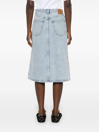 organic cotton denim midi skirt Highlights - Light blue - Organic cotton - Washed denim - Belt loops - Classic five pockets - Logo patch to the rear - Front button and zip fastening Made in Italy Composition Organic Cotton 100% SIZE & FIT Model measurements Height 5 ft 10 in(1.77 m) Bust/Chest 32.28 in(82 cm) Hips 35.03 in(89 cm) Waist 25.19 in(64 cm) Measurement LENGTH 27.55 in(70 cm) WAIST 33.07 in(84 cm) FittingInformation This midi-length skirt is intended to be worn low on the hips Sturdy and hard-wearing, this denim piece offers no stretch This piece fits true to size – take your usual size