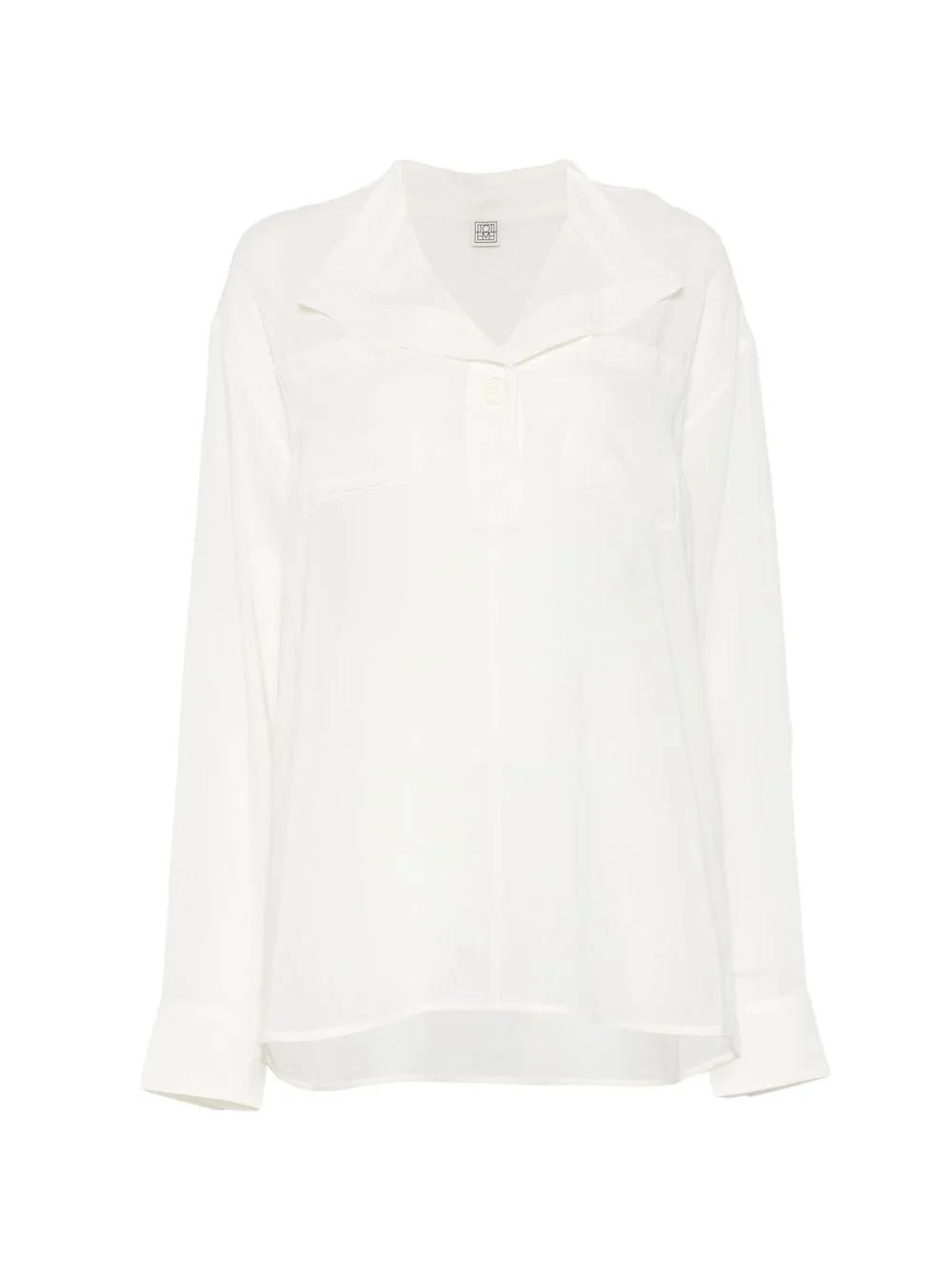overlapping-collar blouse Highlights - Off-white - Overlapping collar - Button fastening - Long sleeves - Buttoned cuffs - Chest pockets Imported Composition Viscose 83%, Wool 17% Washing instructions Dry Clean Only