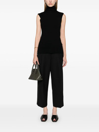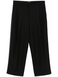 pleated trousers Highlights - Black - Recycled polyester blend - Interlock twill weave - Concealed front fastening - Belt loops - High waist - Satin trim - Pleat detailing - Pressed crease - Two side slit pockets - Two rear button-fastening jetted pockets - Tailored cut - Tapered leg Imported Composition Recycled Polyester 55%, RWS Wool 45% SIZE & FIT Model measurements Height 5 ft 9 in(1.75 m) Bust/Chest 31.88 in(81 cm) Hips 34.64 in(88 cm) Waist 24.01 in(61 cm) FittingInformation Designed with a wide-leg cut, these trousers allow for a close fit at the waist and offer a loose and roomy fit over the leg Made from a midweight non-stretch fabric
