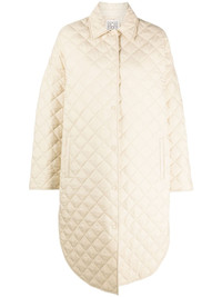 single-breasted quilted coat This light-beige coat by Toteme is characterised by its quilted finish and oversized silhouette that falls to a curved hem. Highlights - Light beige - Quilted - Classic collar - Front button fastening - Long sleeves - Two front welt pockets - Curved hem Imported Composition Outer: Recycled Polyester 100% Lining: Recycled Polyester 100% SIZE & FIT Model measurements Height 5 ft 11 in(1.8 m) Bust/Chest 33.07 in(84 cm) Hips 37.4 in(95 cm) Waist 25.19 in(64 cm) FittingInformation Designed to be unstructured, offering a loose fit throughout Made from a quilted non-stretch fabric, giving it no natural elasticity This piece fits true to size – take your usual size Washing instructions Dry Clean Only