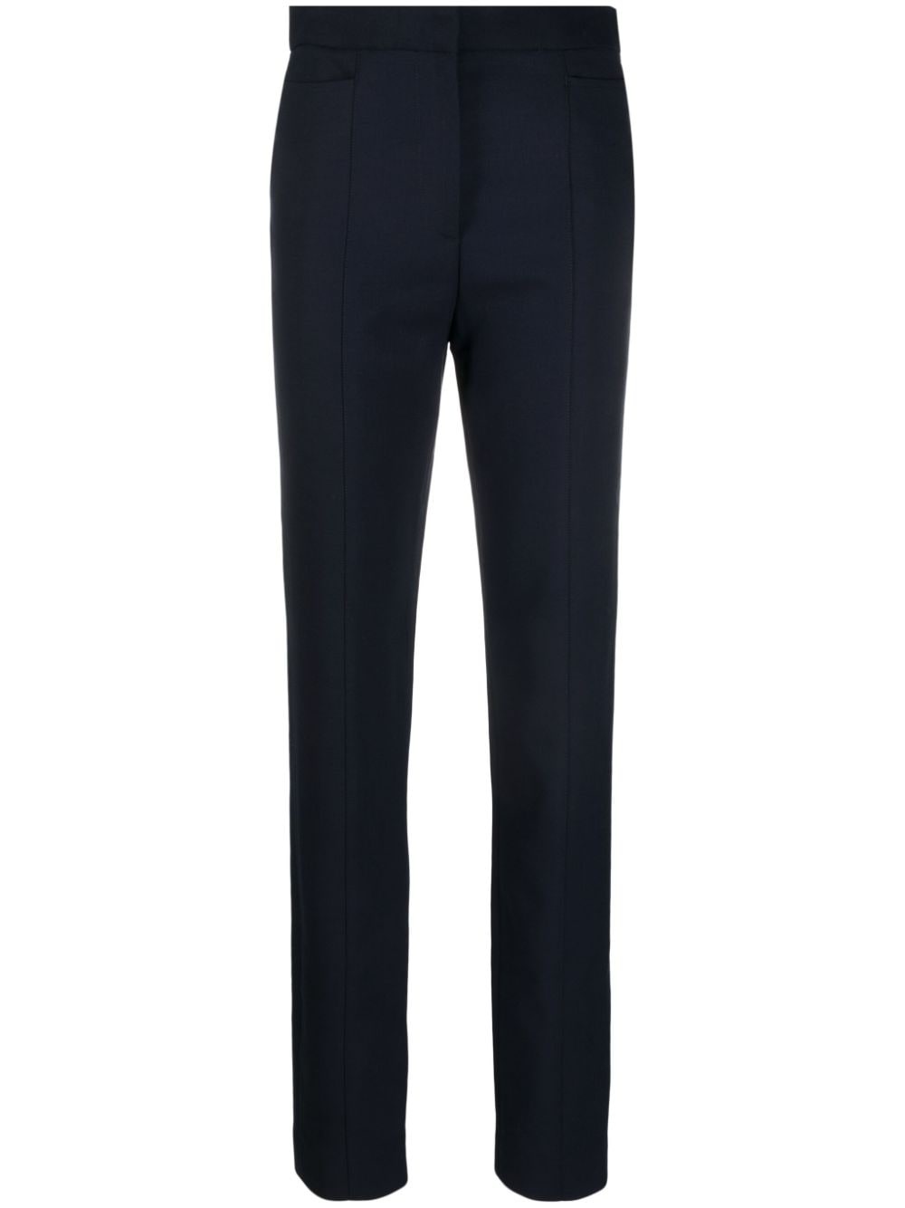 slim-fit tailored trousers TOTEME's minimalist aesthetic is captured in the simplicity of these tailored trousers. The navy-hued pair is cut to a high waist and straight, slim-cut leg which is finished with slit hems, for ease of movement. Highlights - Navy blue - Stretch-design - High waist - Concealed front fastening - Pressed crease - Two rear welt pockets - Straight leg - Rear slit Imported Composition Viscose 87%, Wool 10%, Spandex/Elastane 3% SIZE & FIT Model measurements Height 5 ft 10 in(1.79 m) Bust/Chest 32.67 in(83 cm) Hips 34.25 in(87 cm) Waist 24.4 in(62 cm) FittingInformation Designed with a flared hem, these trousers allow for a close fit at the waist with a slim fit over the leg and widening towards the hem Made from a midweight stretch fabric, this piece offers elasticity and flexibility when worn This piece fits true to size – take your usual size Measurement FRONT RISE 12 in(30.5 cm) INSIDE LEG 34.01 in(86.4 cm) HIPS 32 in(81.3 cm) Hem Width 12 in(30.5 cm) WAIST 27.99 in(71.1 cm)