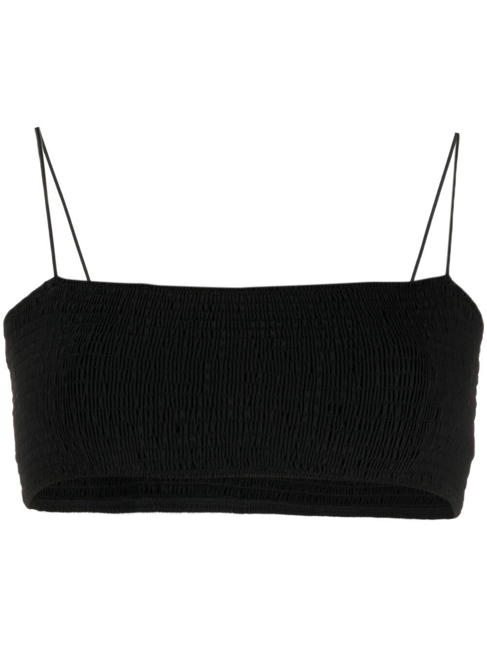 smocked bikini top Highlights - Black - Recycled polyamide - Stretch-design - Spaghetti straps - Square neck - Be mindful to try on swimwear over your own garments. Made in Italy Composition Polyamide 82%, Spandex/Elastane 18% SIZE & FIT Model measurements Height 5 ft 11 in(1.8 m) Bust/Chest 31.49 in(80 cm) Hips 36.61 in(93 cm) Waist 24.4 in(62 cm) FittingInformation This piece fits true to size. We recommend you get your regular size Cut for a close fit Made with a mid-weight stretch fabric