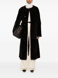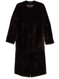 soft shearling coat Highlights - Dark brown - Shearling - Brushed effect - Hook fastening - Round neck - Long sleeves - Two side inset pockets - Suede lining - Straight hem Imported Composition Sheep Skin/Shearling 100% SIZE & FIT Model measurements Height 5 ft 10 in(1.77 m) Bust/Chest 33.07 in(84 cm) Hips 37 in(94 cm) Waist 24.8 in(63 cm) FittingInformation Designed to be unstructured, offering a loose fit throughout Firm shearling has a treated construction offering some durability