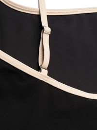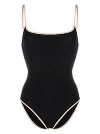 striped-edge spaghetti-strap swimsuit Highlights - Black/beige - Recycled polyamide blend - Stretch-design - One-piece design - Piped-trim detailing - U-neck - Adjustable spaghetti straps - Low back - High cut - Be mindful to try on swimwear over your own garments. Imported Composition Outer: Recycled Polyamide 60%, Spandex/Elastane 29%, Polyamide 11% Lining: Recycled Polyamide 60%, Polyamide 24%, Spandex/Elastane 15% Washing instructions Machine Wash