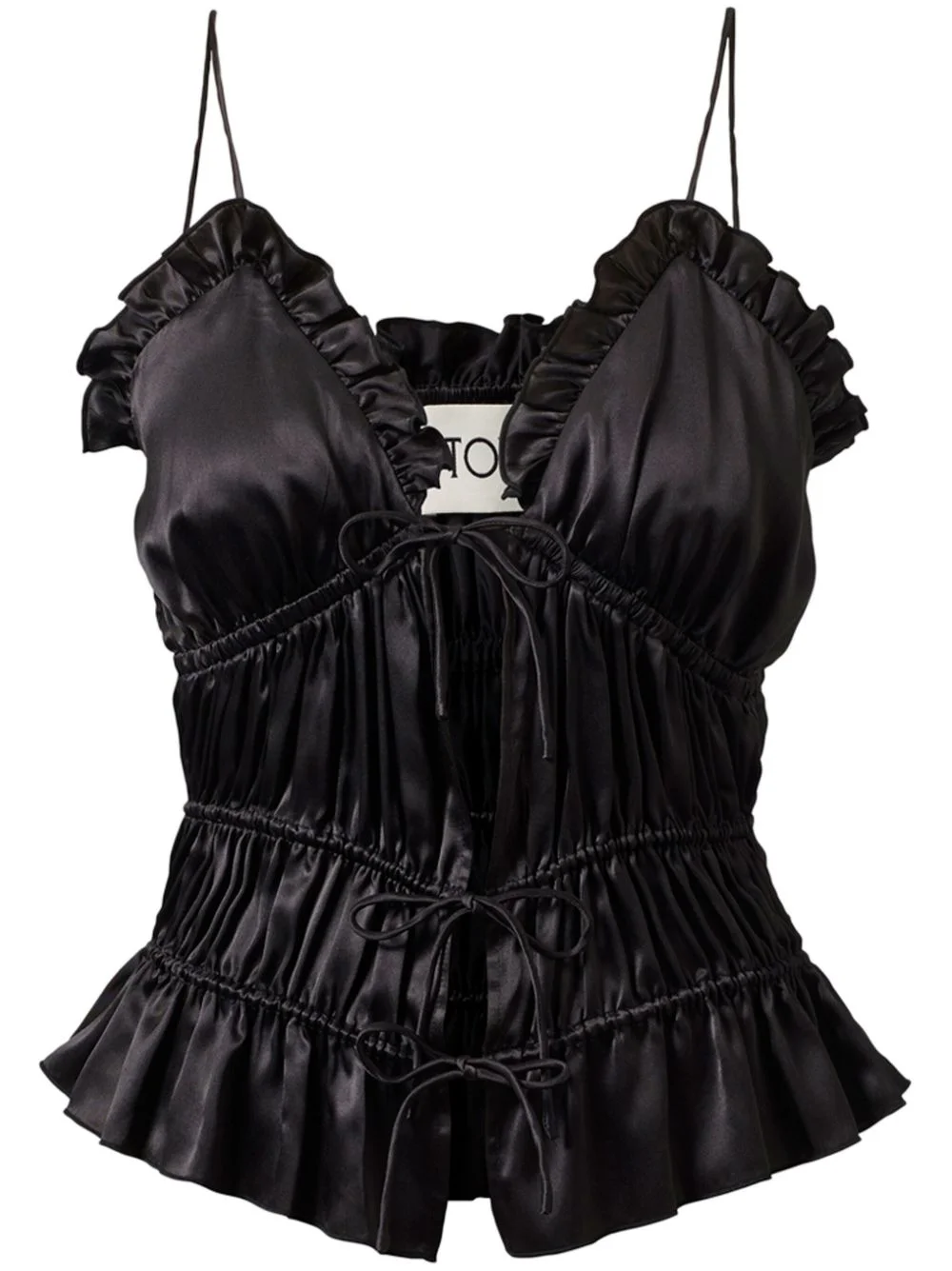 Keonie blouse Highlights - Black - Silk - Satin finish - Front tie fastening - Spaghetti straps - V-neck - Ruffled trim - Sleeveless - Gathered detailing - Pleat detailing - Ruffle hem Imported Composition Silk 100% Washing instructions Read Manufacturer Guidelines