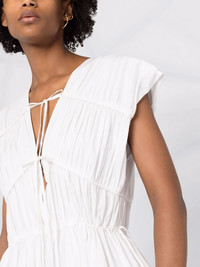 Phoebe organic cotton dress Highlights - White - Organic cotton - Gathered detailing - Front tie fastening - V-neck - Cap sleeves - A-line skirt Imported Composition Lining: Cotton 100% Outer: Cotton 100% SIZE & FIT Model measurements Height 5 ft 11 in(1.8 m) Bust/Chest 31.49 in(80 cm) Hips 35.82 in(91 cm) Waist 24.8 in(63 cm) FittingInformation This piece fits true to size. We recommend you get your regular size Cut for a loose fit Made with a mid-weight non-stretch fabric