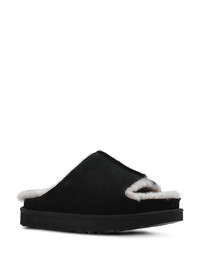 Greenport slides Highlights - Black - Rubber sole - Single toe strap - Faux-shearling trim - Logo print to the side Imported Composition Lining: Sheep Skin/Shearling 100% Sole: Rubber 100% Outer: Suede 100%