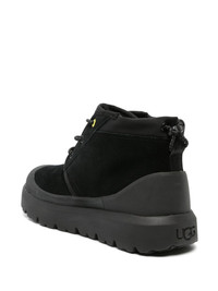 Neumel Weather Hybrid boots Leaders in practical and cosy footwear, UGG's Neumel Weather Hybrid boots are crafted from soft suede. With a debossed logo on the tongue, they feature a rubber toecap and a practical pull tab at the heel. Highlights - Black - Calf suede - Logo-debossed tongue - Rubber toecap - Round toe - Front lace-up fastening - Rear toggle fastening - Ankle-length - Pull-tab at the heel - Branded insole - Logo at the sole - Rubber lug sole Imported Composition Lining: Fabric 100% Outer: Calf Suede 100%, Rubber 100%, Fabric 100% Sole: Rubber 100% SIZE & FIT Measurement HEEL 1.57 in(4 cm) HEIGHT 4.33 in(11 cm) Sole height 1.37 in(3.5 cm)