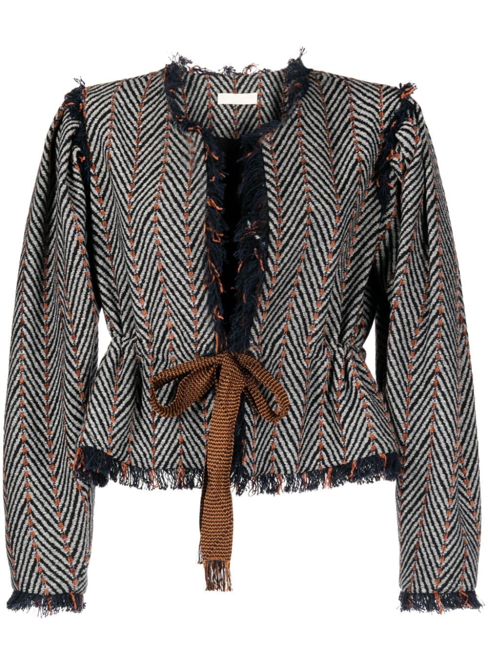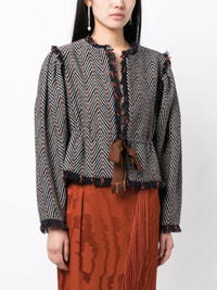 Ames herringbone tweed jacket Highlights - Black/orange - Cotton blend - Tweed - Herringbone pattern - Frayed detailing - Round neck - Ribbon fastening - Long sleeves - Peplum waist Imported Composition Outer: Cotton 72%, Acrylic 13%, Polyester 11%, Wool 4% Lining: Polyester 100% SIZE & FIT Model measurements Height 5 ft 10 in(1.77 m) Bust/Chest 28.74 in(73 cm) Hips 35.82 in(91 cm) Waist 24.4 in(62 cm) FittingInformation Designed to be unstructured, offering a loose fit throughout The adjustable drawstring means that you can adjust this piece’s fit to suit your comfort and preference Made with a midweight knit, this piece offers some stretch This piece fits true to size – take your usual size Washing instructions Dry Clean Only