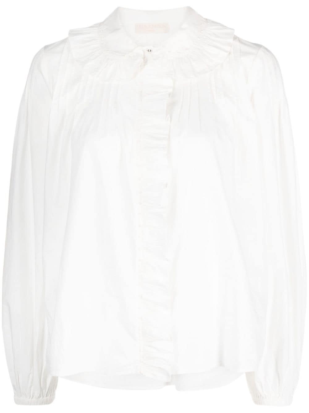 Dolores cotton blouse Highlights - White - Cotton - Poplin texture - French knot detailing - Pintuck detailing - Ruffled detailing - Round neck - Concealed front button fastening - Long bishop sleeves - Elasticated cuffs - Straight hem Imported Composition Cotton 100% SIZE & FIT Model measurements Height 5 ft 11 in(1.8 m) Bust/Chest 33.07 in(84 cm) Hips 37.4 in(95 cm) Waist 25.19 in(64 cm) FittingInformation Designed to be unstructured, offering a loose fit throughout Made from a midweight non-stretch fabric This piece fits true to size – take your usual size