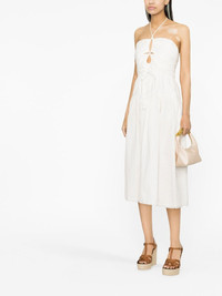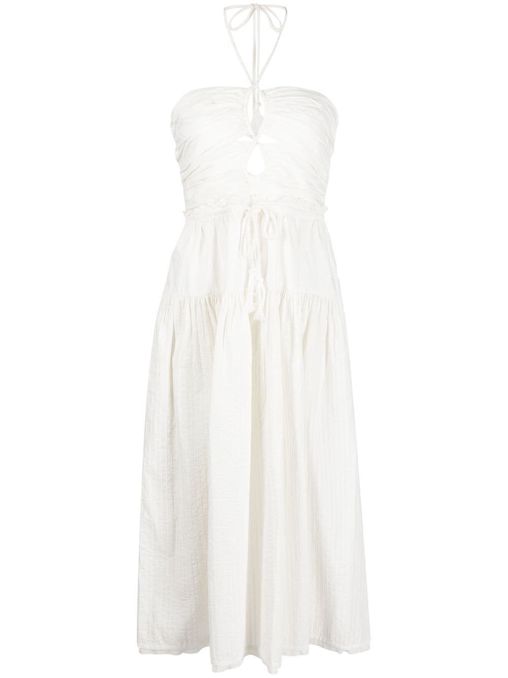Ella halterneck midi dress This Ella dress highlights Ulla Johnson's take on the classic halterneck. Designed in a white hue, the style features cut-outs cascading down the upper which are framed by gathering throughout. Imported Composition Cotton 100% SIZE & FIT Model measurements Height 5 ft 10 in(1.77 m) Bust/Chest 32.67 in(83 cm) Hips 35.43 in(90 cm) Waist 23.62 in(60 cm) Measurement CHEST 32.28 in(82 cm) HIPS 40.94 in(104 cm) LENGTH 46.85 in(119 cm) WAIST 29.52 in(75 cm) FittingInformation This piece fits true to size. We recommend you get your regular size Designed for a close fit at the bust and waist, but loose at the hip Made with a mid-weight non-stretch fabric