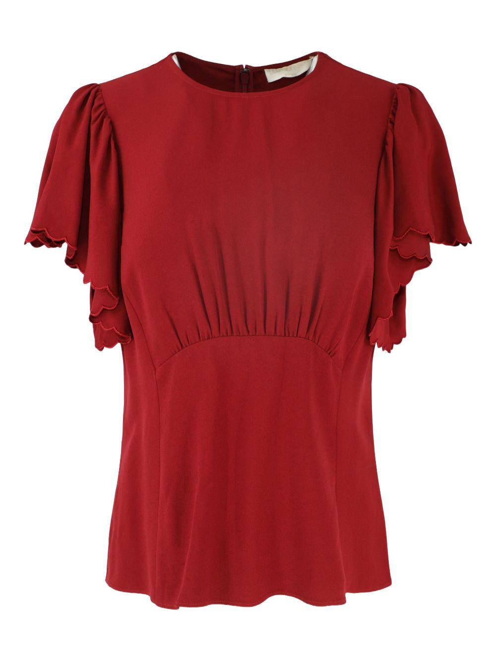 flutter-sleeves scalloped blouse Highlights - Red - Flutter sleeves - Scalloped edges - Round neck - Concealed zip fastening Imported Composition Fabric 100% Washing instructions Read Manufacturer Guidelines