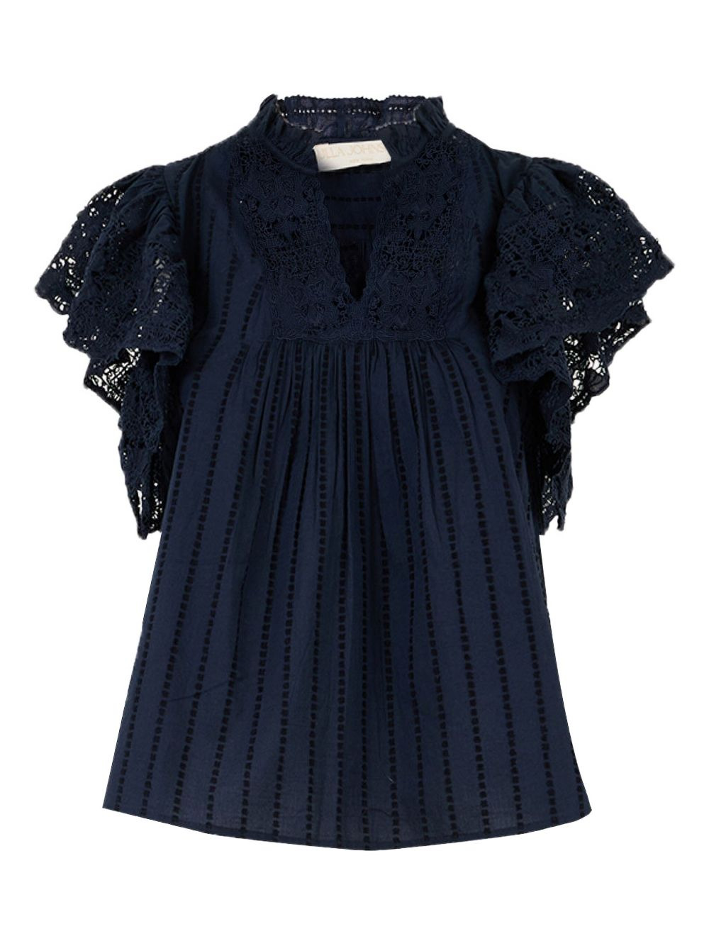 Julie futter-sleeve blouse Highlights - Navy blue - Lace detail - Ruffled collar - Short sleeves - Eyelet detail - V-neck Imported Composition Fabric 100% Washing instructions Read Manufacturer Guidelines