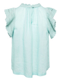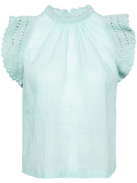 Kai blouse Highlights - Aqua blue - Ramie - Crochet trim - Mock neck - Rear button fastening - Short sleeves - Straight hem Imported Composition Ramie 100% Trims: Cotton 100% SIZE & FIT FittingInformation Designed to be unstructured, offering a loose fit throughout Made from a lightweight non-stretch fabric This piece fits true to size – take your usual size