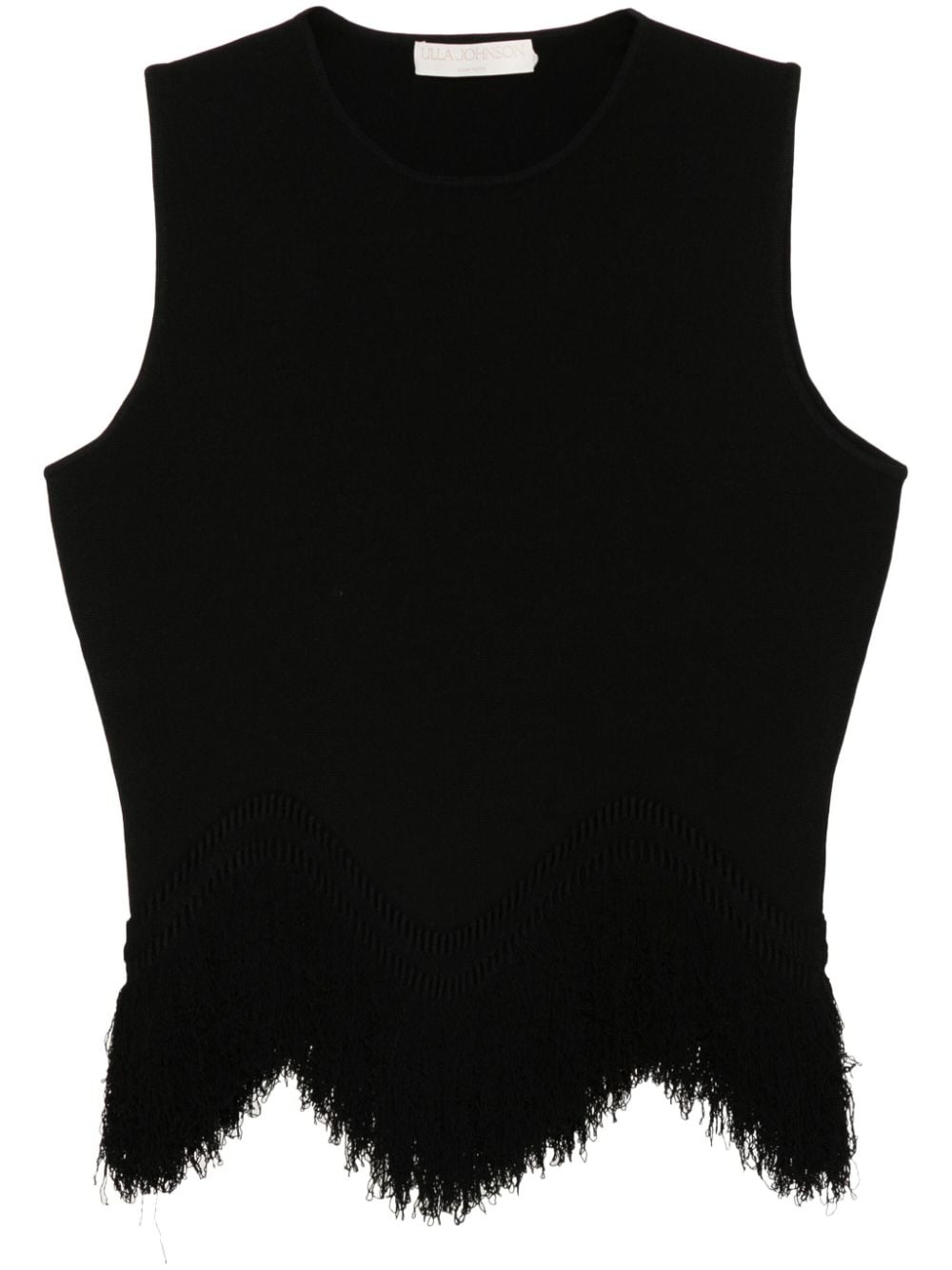 Koa fringed top Highlights - Black - Knitted construction - Stretch-design - Round neck - Sleeveless - Fringe detailing - Asymmetric hem Imported Composition Viscose 83%, Polyester 17% SIZE & FIT Model measurements Height 5 ft 10 in(1.78 m) Bust/Chest 32.67 in(83 cm) Hips 35.43 in(90 cm) Waist 23.22 in(59 cm) FittingInformation Designed for a slim fit that sits just away from the body offering a close yet comfortable fit Made with a midweight knit, this piece offers some stretch This piece fits true to size – take your usual size