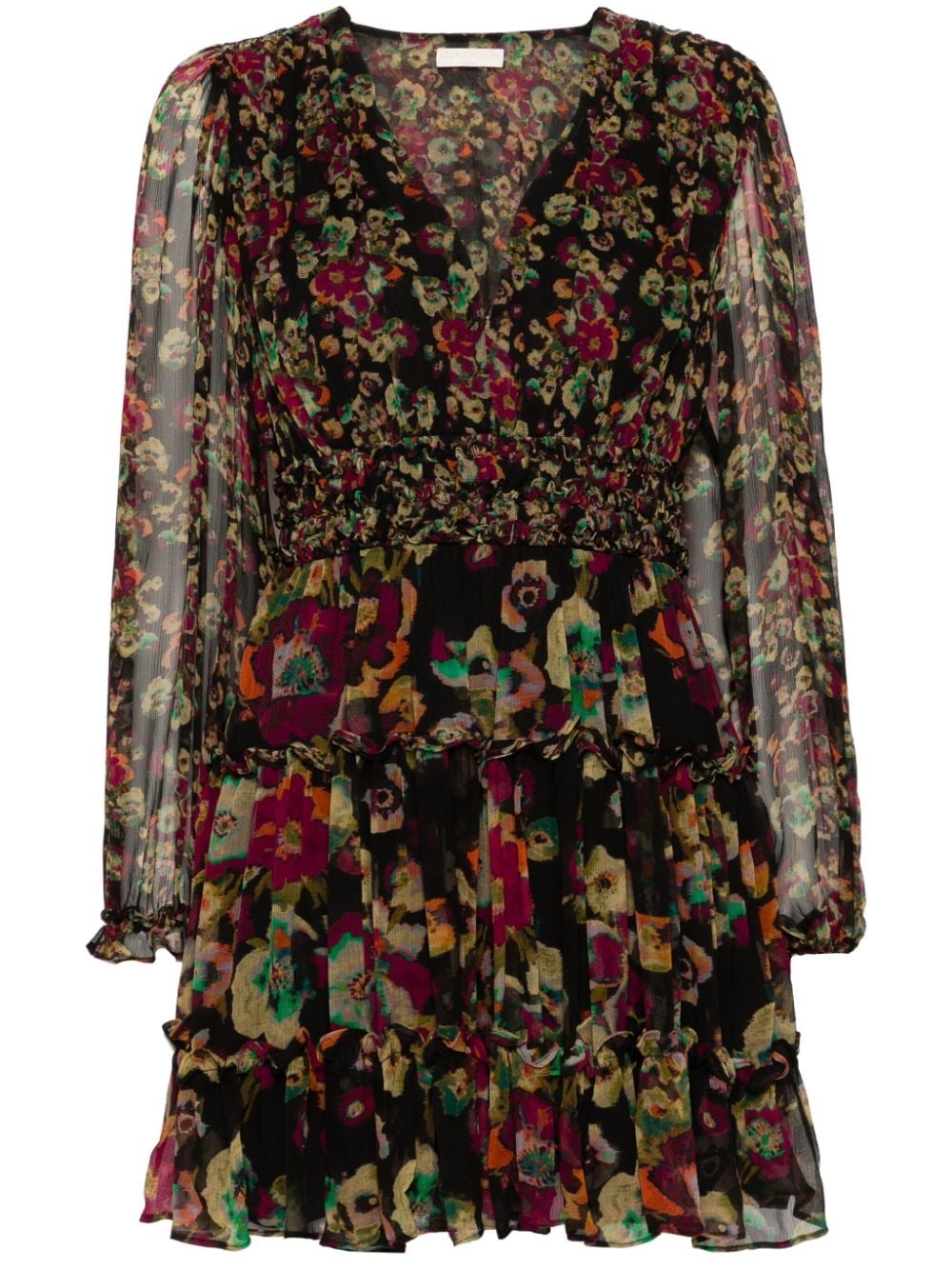 Lya floral-print mini dress Highlights - Black/multicolour - Silk - Georgette crepe - All-over floral print - V-neck - Chest pleat detailing - Semi-sheer long puff sleeves - Elasticated cuffs with ruffled trim - Fitted waistline - Flared tiered skirt - Two side inset pockets - Thigh-length - Ruffle hem - Concealed side zip fastening Imported Composition Outer: Silk 100% Lining: Polyester 100% SIZE & FIT Model measurements Height 5 ft 11 in(1.8 m) Bust/Chest 31.49 in(80 cm) Hips 35.82 in(91 cm) Waist 24.8 in(63 cm) FittingInformation Designed for a close fit at the chest and waist with a loose fit at the hip Made from a midweight non-stretch fabric This piece fits true to size – take your usual size