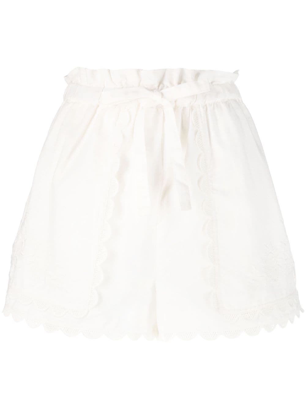 Nellie embroidered shorts Highlights - Ivory white - Cotton-linen blend - Embroidered design - Layered design - Ruched detailing - Scallop edge - Thigh-length - Two side inset pockets - Elasticated drawstring waistband Imported Composition Linen/Flax 60%, Cotton 40% SIZE & FIT Model measurements Height 5 ft 11 in(1.8 m) Bust/Chest 33.07 in(84 cm) Hips 37.4 in(95 cm) Waist 25.19 in(64 cm) FittingInformation Designed for a loose fit, offering comfort and movement when worn Adjust this piece’s waistband to your preference using the drawstring Made from a midweight non-stretch fabric This piece fits true to size – take your usual size
