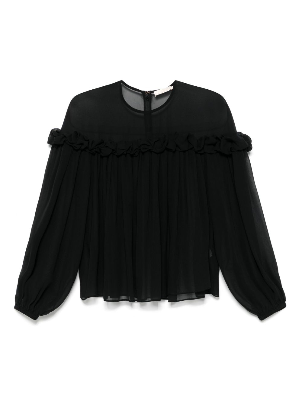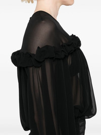 Peggy blouse Highlights - Black - Concealed rear hook and zip fastening - Elasticated cuffs - Ruffled detailing - Balloon sleeves Imported Composition Silk 100% SIZE & FIT Model measurements Height 5 ft 9 in(1.75 m) Bust/Chest 34.64 in(88 cm) Hips 36.61 in(93 cm) Waist 26.37 in(67 cm) FittingInformation Designed to be unstructured, offering a loose fit throughout Made from a lightweight non-stretch fabric Washing instructions Dry Clean Only