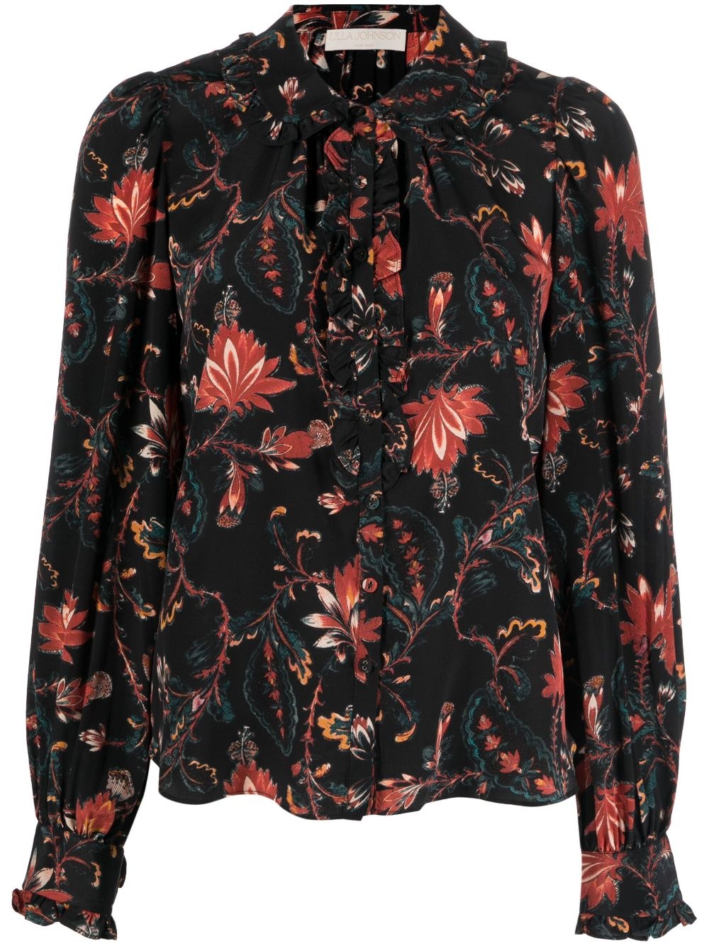 Philipa floral-print blouse For Pre-Fall '23, Ulla Johnson's Philipa blouse is revamped in a vibrant floral pattern that pops against the black background. Crafted from silk crepe de chine, the languid silhouette is topped with a pussybow collar. Highlights - Black - Silk - Crepe de chine - All-over floral print - Ruffled trim - Peter pan collar - Front button fastening - Balloon sleeves - Buttoned cuffs Imported Composition Silk 100% SIZE & FIT Model measurements Height 5 ft 10 in(1.78 m) Bust/Chest 31.49 in(80 cm) Hips 35.03 in(89 cm) Waist 23.62 in(60 cm) FittingInformation Designed to be unstructured, offering a loose fit throughout Made from a lightweight non-stretch fabric This piece fits true to size – take your usual size
