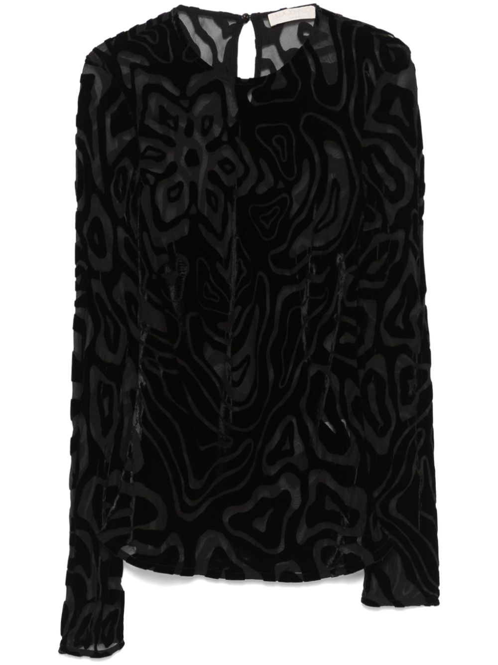 Quinn top Highlights - Black - Flocked finish - Single rear button fastening - Semi-sheer panels - Crew neck - Long sleeves - Straight hem Imported Composition Viscose 80%, Silk 20% SIZE & FIT Model measurements Height 5 ft 9 in(1.75 m) Bust/Chest 31.88 in(81 cm) Hips 34.64 in(88 cm) Waist 24.01 in(61 cm) FittingInformation Designed for a slim fit that sits just away from the body offering a close yet comfortable fit Made from a lightweight non-stretch fabric