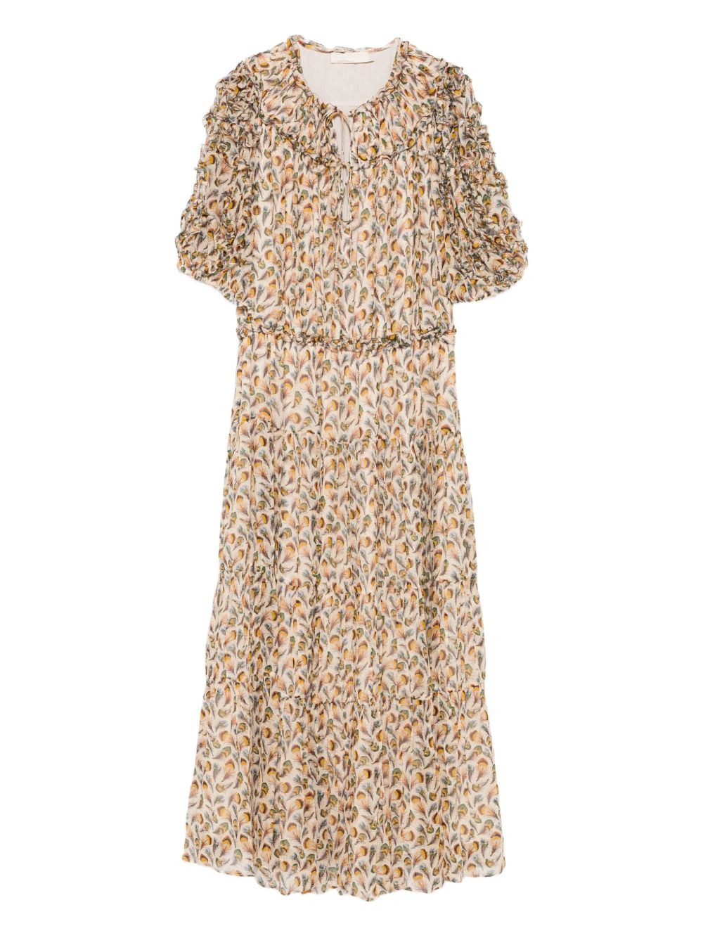 ruffled floral-print midi dress Highlights - Ecru - Floral print - Ruffled neckline - Short ruffled sleeves - Tiered skirt Imported Composition Silk 100% SIZE & FIT Model measurements Height 5 ft 9 in(1.76 m) Bust/Chest 31.49 in(80 cm) Hips 35.03 in(89 cm) Waist 24.8 in(63 cm) Washing instructions Dry Clean Only