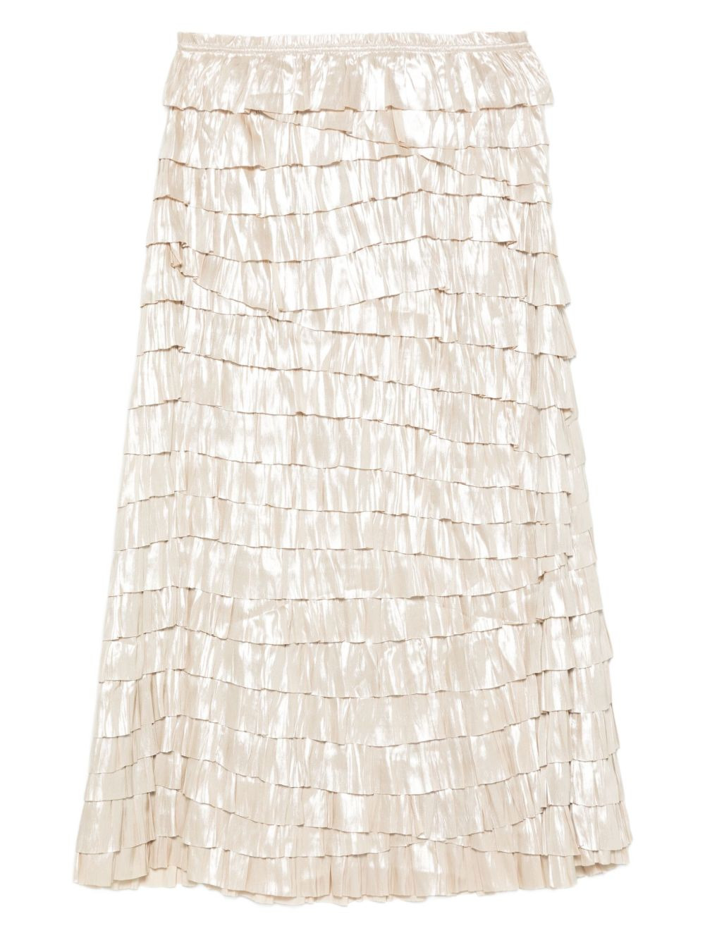 ruffled metallic-effect midi skirt Highlights - Ivory - Ruffled detailing - Tiered layers - Metallic sheen - Pleated texture Imported Composition Recycled Polyester 55%, Polyester 45% SIZE & FIT Model measurements Height 5 ft 10 in(1.77 m) Bust/Chest 33.07 in(84 cm) Hips 37 in(94 cm) Waist 24.8 in(63 cm) Washing instructions Read Manufacturer Guidelines