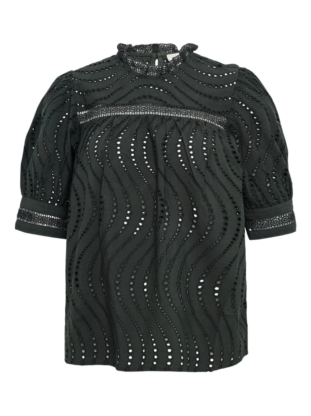 short-sleeve blouse Highlights - Green - Lace detail - Short sleeves - Eyelet detail - High neck - Ruffled collar Imported Composition Cotton 100% Washing instructions Machine Wash