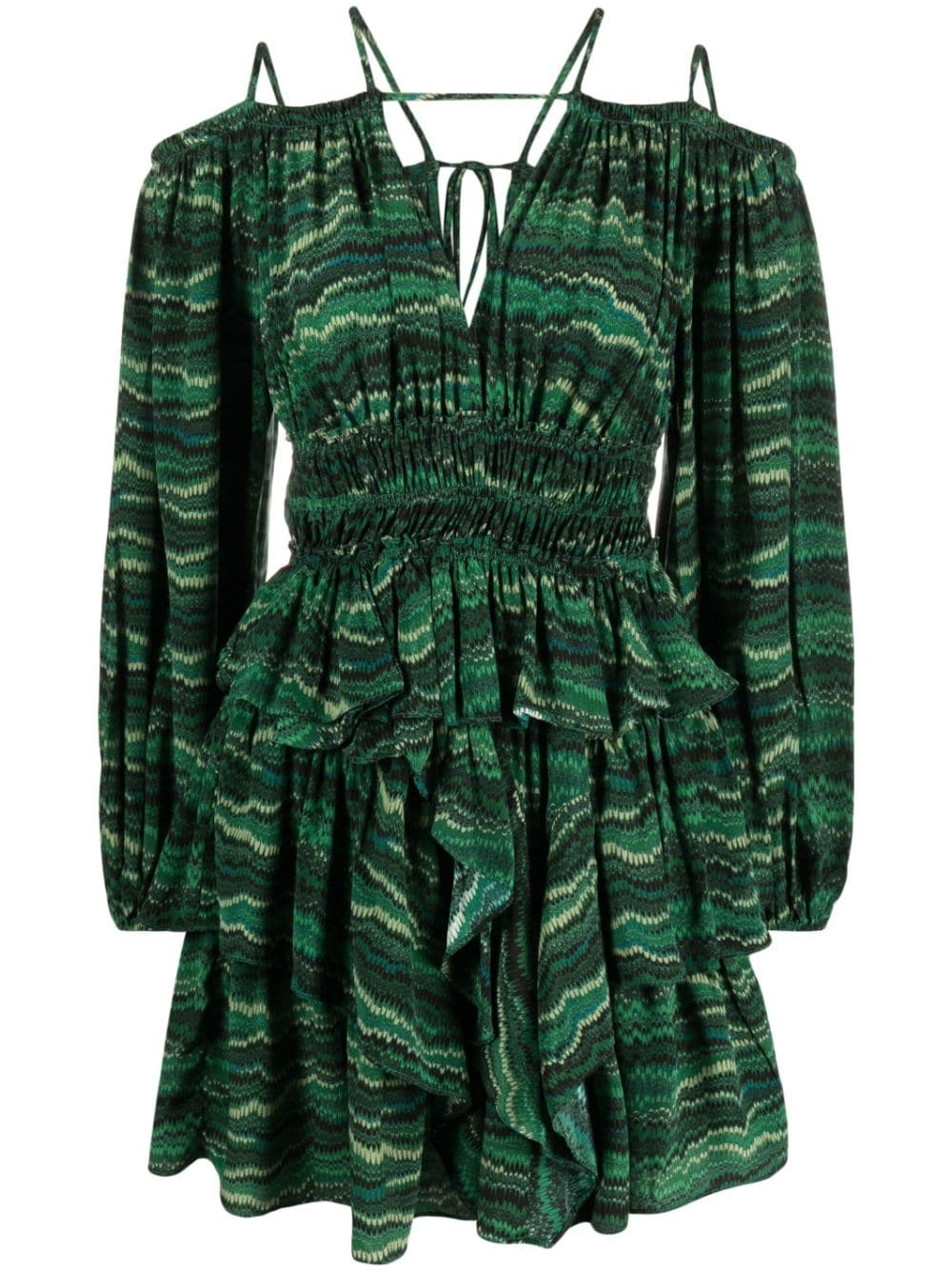 Silvia off-shoulder silk minidress emerald green silk abstract pattern print off-shoulder long sleeves rear tie fastening smocked waist tiered skirt straight hem Imported Composition Silk 100%