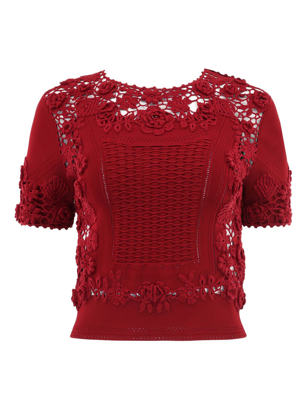 Stella crochet-lace top Highlights - Red - Crochet lace - Short sleeves - Floral details Imported Composition Cotton 47%, Viscose 44%, Polyester 9% Washing instructions Read Manufacturer Guidelines