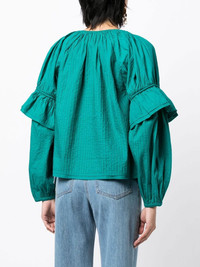 tie-front puff-sleeve blouse teal green cotton decorative stitching pleat detailing keyhole neck long puff sleeves straight hem Imported Composition Body: Cotton 100% SIZE & FIT Model measurements Height 5 ft 10 in(1.77 m) Bust/Chest 31.49 in(80 cm) Hips 35.43 in(90 cm) Waist 25.19 in(64 cm) FittingInformation This piece fits true to size. We recommend you get your regular size Cut for a loose fit Made with a mid-weight fabric