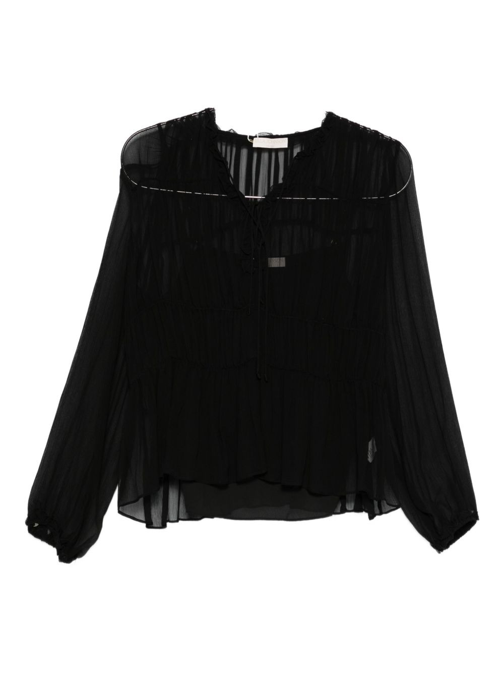 tie-neck ruffled blouse Highlights - Black - Ruffled detail - Tie fastening - Long sleeves - Sheer finish Imported Composition Silk 100% Washing instructions Dry Clean Only