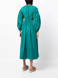 Viviana smocked dress teal green cotton smocking details round neck exposed rear zip fastening long puff sleeves calf-length Imported Composition Body: Cotton 100% SIZE & FIT Model measurements Height 5 ft 10 in(1.77 m) Bust/Chest 31.49 in(80 cm) Hips 35.43 in(90 cm) Waist 25.19 in(64 cm) FittingInformation This piece fits true to size. We recommend you get your regular size Cut for a loose fit Made with a mid-weight non-stretch fabric