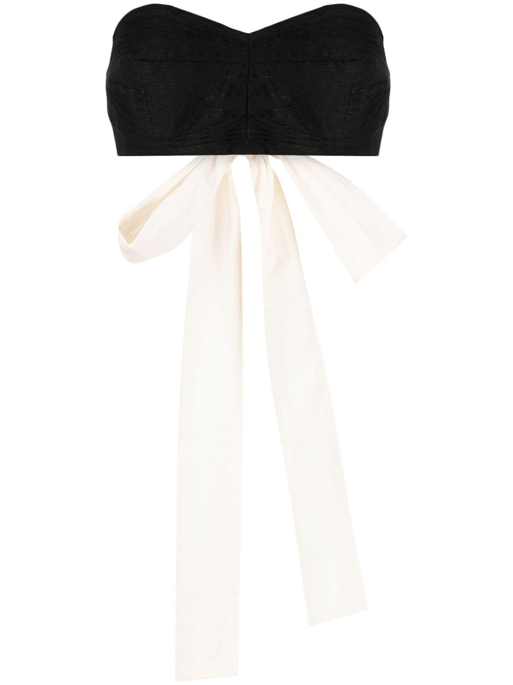 bow-fastening cropped top Highlights - Black/white - Cotton-linen blend - Sweetheart neck - Sleeveless - Rear bow fastening - Cropped Made in Italy Composition Body: Cotton 53%, Linen/Flax 47% SIZE & FIT Model measurements Height 5 ft 10 in(1.78 m) Bust/Chest 30.31 in(77 cm) Hips 34.64 in(88 cm) Waist 24.01 in(61 cm) Measurement LENGTH 43.3 in(110 cm) HEIGHT 5.51 in(14 cm) WIDTH 16.92 in(43 cm) FittingInformation Designed for a very close and sculpting fit The tie fastening gives an adaptable and personalised fit Made from a midweight non-stretch fabric This piece is only produced in one size