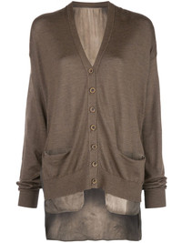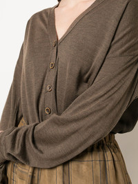 buttoned fine knit cardigan Dark brown wool blend buttoned fine knit cardigan from Uma Wang featuring ribbed details, a deep V neck, long sleeves, fitted cuffs, front pockets and a straight hem. Made in Italy Composition Silk 35%, Wool 35%, Cashmere 30% SIZE & FIT Model measurements Height 5 ft 10 in(1.77 m) Bust/Chest 31.88 in(81 cm) Hips 33.85 in(86 cm) Waist 24.01 in(61 cm) Washing instructions Dry Clean Only