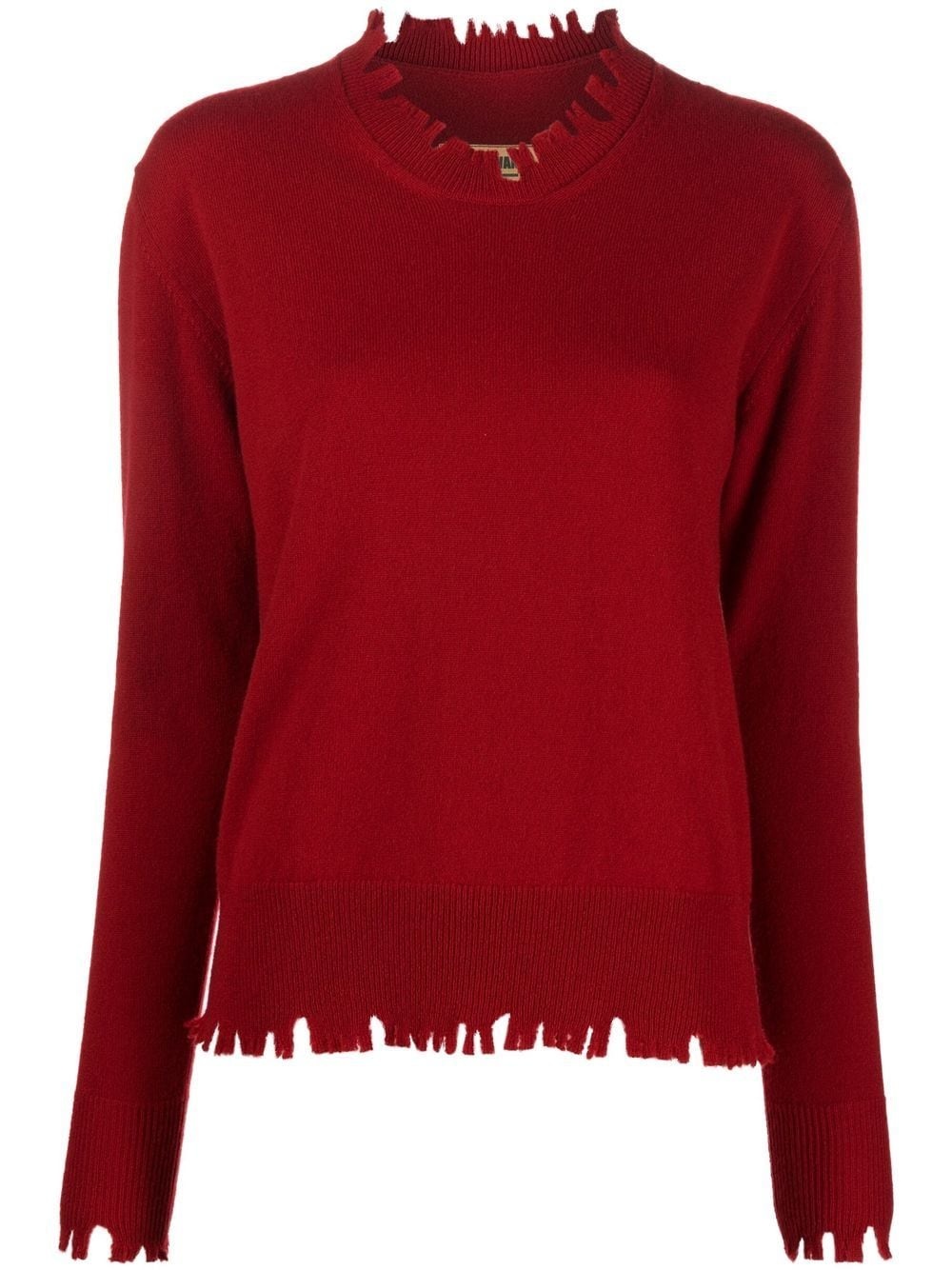 distressed-edge knit jumper dark red cashmere ribbed detailing distressed finish round neck long sleeves straight hem Made in Italy Composition Cashmere 100% SIZE & FIT Model measurements Height 5 ft 9 in(1.74 m) Bust/Chest 32.28 in(82 cm) Hips 35.82 in(91 cm) Waist 24.01 in(61 cm) FittingInformation This piece fits true to size. We recommend you get your regular size Cut for a relaxed fit Made with a mid-weight fabric Washing instructions Hand Wash