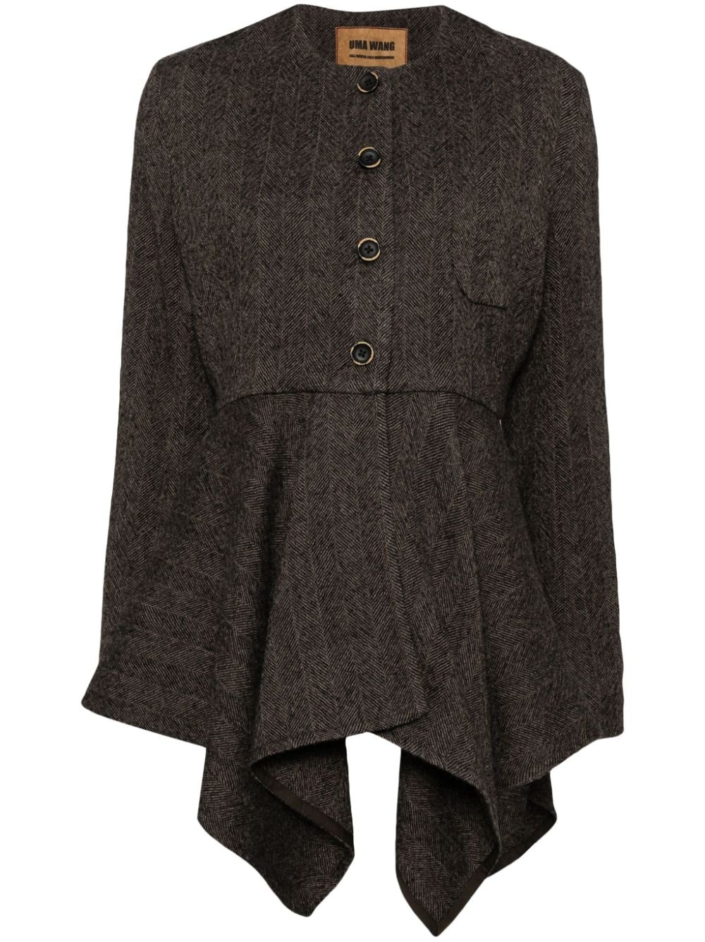 Koney jacket Highlights - Black/brown - Virgin wool - Herringbone pattern - Collarless - Front button fastening - Long sleeves - Chest patch pocket - Handkerchief hem Made in Italy Composition Lining: Cupro 50%, Viscose 50% Outer: Virgin Wool 100% SIZE & FIT Model measurements Height 5 ft 10 in(1.77 m) Bust/Chest 31.49 in(80 cm) Hips 35.43 in(90 cm) Waist 25.19 in(64 cm) FittingInformation Designed for a close fit at the chest and waist with a loose fit at the hip Made from a midweight non-stretch fabric This piece fits true to size – take your usual size