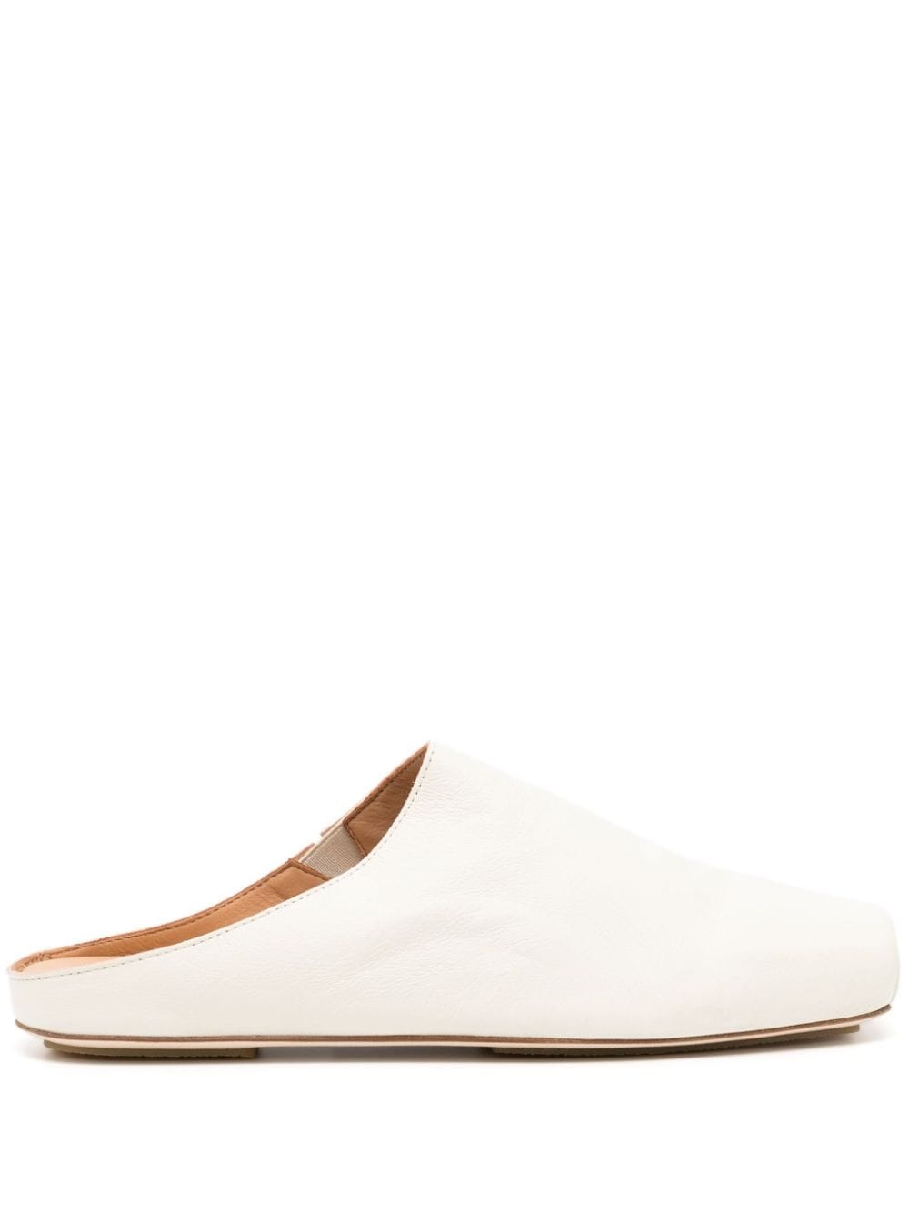 square-toe leather slippers Highlights - White - Calf leather - Slip-on style - Square toe - Branded leather insole - Flat rubber sole Made in Italy Composition Sole: Calf Leather 50%, Rubber 50% Outer: Calf Leather 100% Lining: Calf Leather 100% SIZE & FIT Measurement HEEL 0.98 in(2.5 cm)